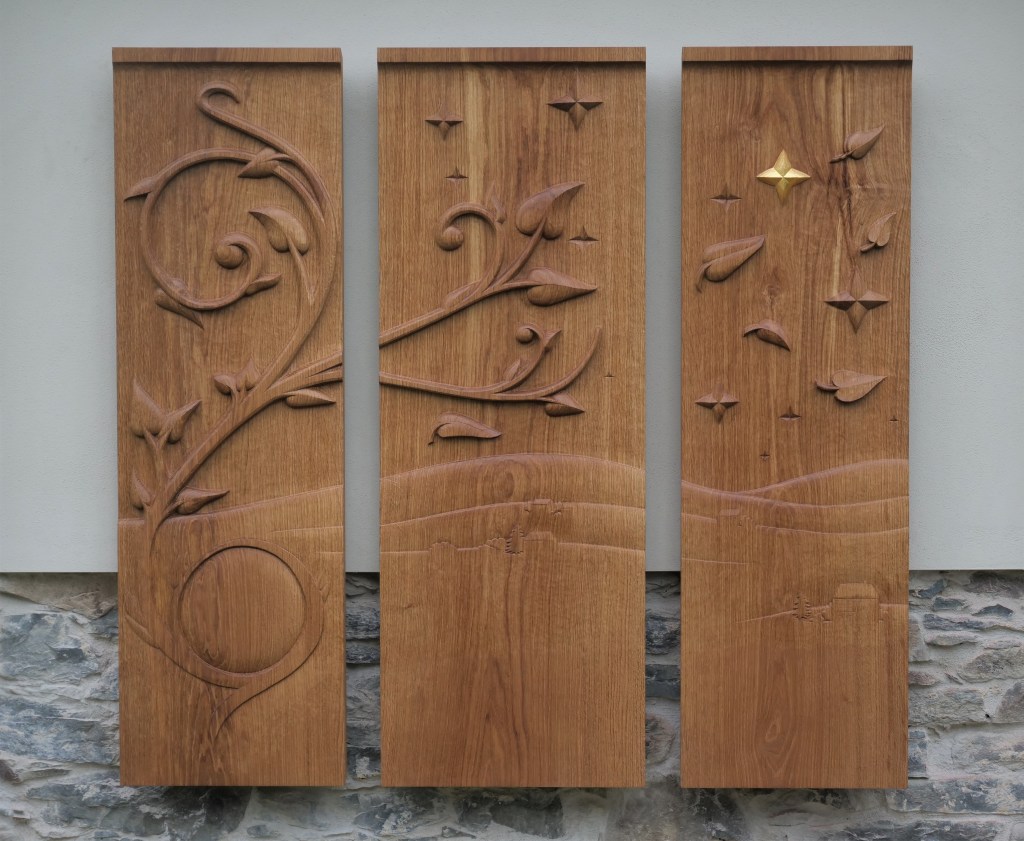 Nach vielen Gesprächen, Gedanken und schließlich Skizzen entstand ein Entwurf und daraufhin ein handgeschnitztes Relief in Eiche, mit einem vergoldeten Stern.